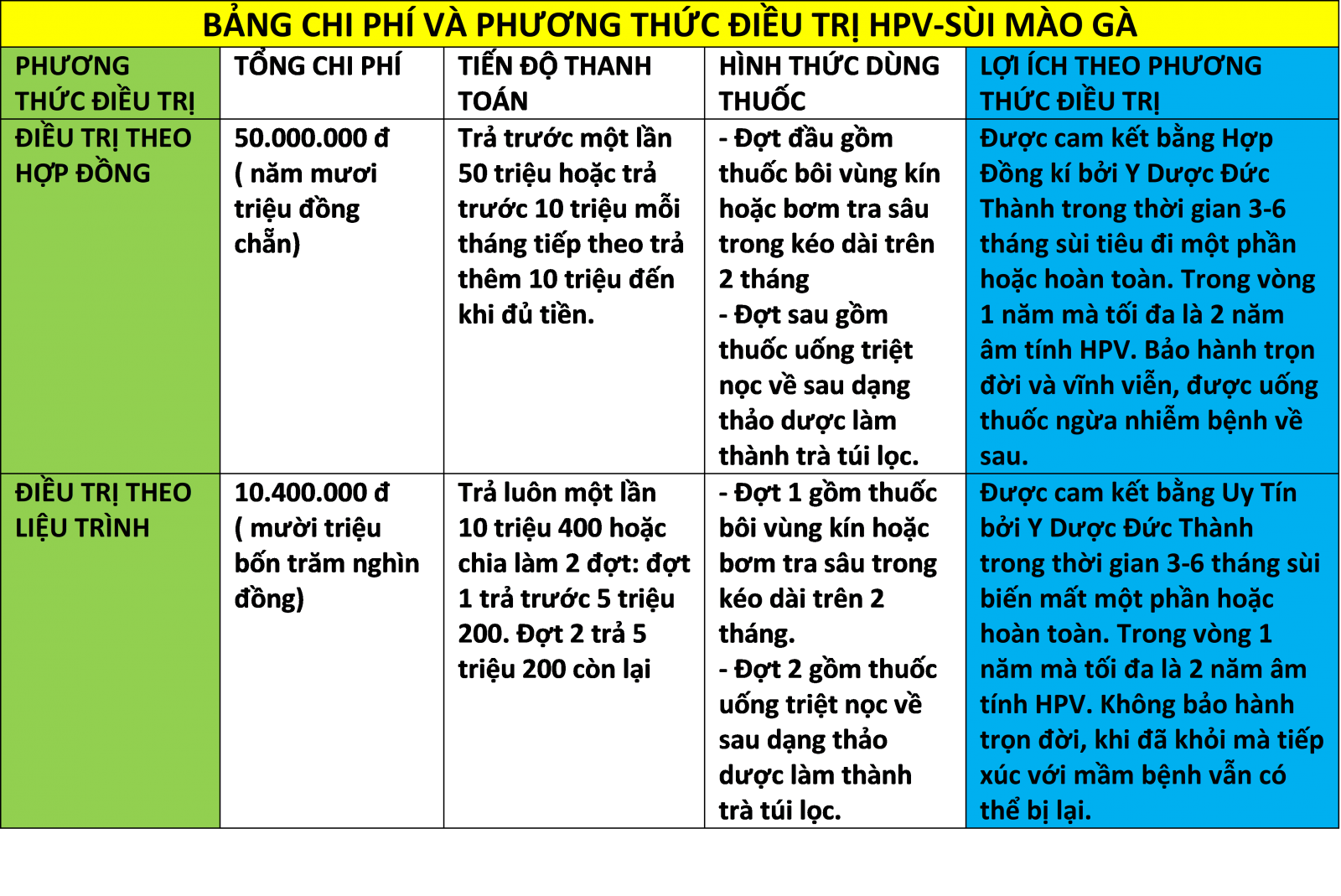 Hiện nay các phương pháp cắt đốt chỉ tạm thời làm sùi mào gà bị rụi đi nhưng không chữa dứt điểm tận gốc được HPV, các loại thuốc tăng đề kháng quảng cáo không giúp được gì chỉ là sự ngộ nhận khi nhiều trường hợp đốt đi đốt lại sùi mào gà cũng tạm thời không mọc lại. Các loại thuốc mang tính acid chấm sùi cũng không khá hơn, đặc biệt nhiều loại thuốc nam chữa sùi mào gà quảng cáo chữa khỏi sùi mào gà trong vài tuần thực chất lại acid trá hình. Thuốc đặc trị HPV gây bệnh sùi mào gà của Y Dược Đức Thành được sản xuất bởi công ty Dược Phẩm và Y Tế Đức Thành bao gồm vài lọ thuốc bôi dạng tinh dầu có chứa hợp chất Melaxin Cituorious có khả năng thẩm thẩu vào sâu tế bào niêm mạc nơi bị nhiễm tiêu diệt tận gốc HPV làm sùi tự đẩy hết gốc rễ mầm bệnh ra tiêu đi sạch sẽ, đi kèm là vài gói thuốc uống thảo dược dạng trà để triệt nọc HPV từ bên trong. Các trường hợp chỉ nhiễm HPV mà không lên sùi mào gà hoặc tạm thời đốt sùi chưa mọc lại nhưng vẫn còn HPV thì dùng thuốc xong xét nghiệm hoàn toàn âm tính.
